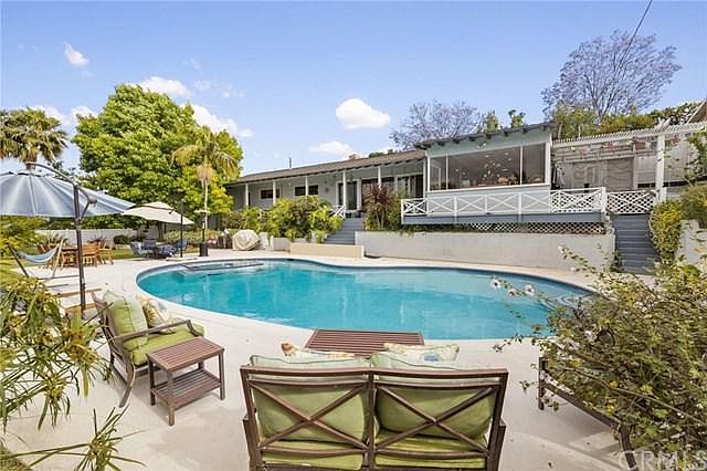 At the end of a cul-de-sac, under a canopy of jacaranda, you will find this remarkable retreat property on a massive lot. Enjoy endless summer fun at home with your own enormous pool, recently added spa, generous patio for lounging, grassy yard for playing & fruit trees for picking. This home is incredibly connected to the inviting outdoor space by numerous glass doors & picture windows perfect for bringing the outdoors in. Upon entering, you may first notice the PV stone fireplace in the formal living room, as well as upgrades such as eco-friendly Cali bamboo flooring, recessed lighting& skylights for more sunshine. Featuring the ultimate open concept floorplan, the remodeled kitchen is connected to both the living & dining rooms via bar seating. The kitchen is the heart of the home & your loved ones will gather here given the newer glazed cabinetry, Cambria quartz countertops, subway tile backsplash & stainless steel appliances including Viking stove. The formal dining space flows out to a cozy deck complete with a conversation firepit for evenings in. The separated family room is a dream to contain toys out of your main living space. 2 ample secondary bedrooms connected by an upgraded bathroom plus a private Master suite featuring 2 closets & full bathroom including enhanced finishes complete this wing. The 4th bedroom is on the opposite side ideal for guest quarters with a 3/4 bathroom doubling as the pool rest/changing room. Master the art of loving where you live here!
