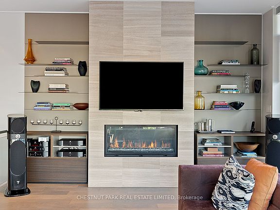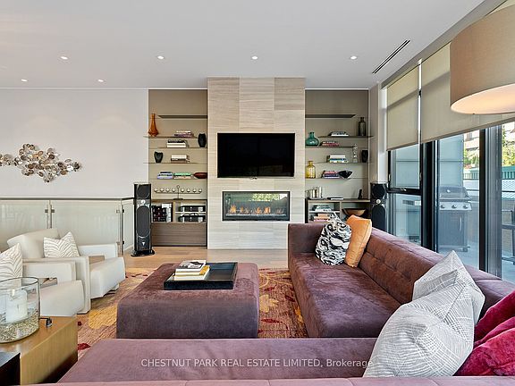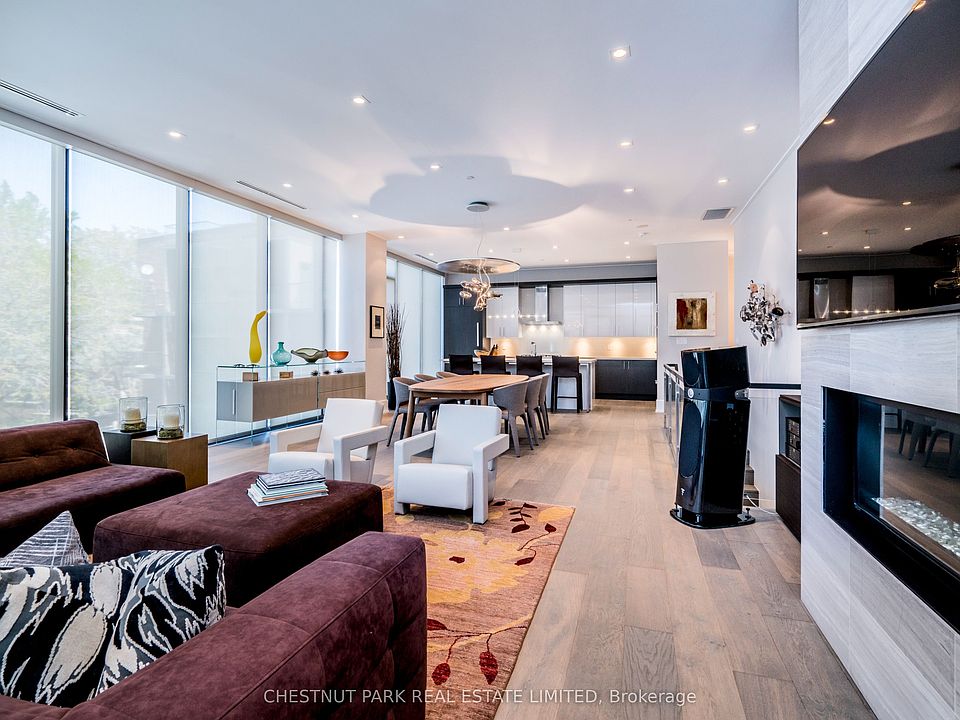 Stunningly beautiful and rarely offered, this spacious two-storey suite in one of Yorkvilles most coveted boutique residences is the perfect urban retreat. Offering over 2,100 square feet of light-filled living space, this 2+1 bedroom, 3 bathroom home with a wrap around terrace is ideal as a sophisticated pied-à-terre or for those looking to downsize without compromise. The main floor is designed for elegant living and effortless entertaining. It features an expansive open-concept layout with a generous foyer, stylish powder room, and a seamless flow between the living room, dining area, and oversized kitchen. The living room is anchored by a gas fireplace with a feature wall, flanked by sleek glass shelving and custom lower cabinetry. From here, step out onto a private balcony - perfect for morning coffee or evening cocktails. The chef's kitchen is outfitted with built-in Miele appliances, Caesarstone countertops, a large centre island, and custom cabinet organizers, making it as functional as it is stylish. Hardwood floors run throughout, while floor-to-ceiling, wall-to-wall windows with Lutron motorized shades provide beautiful natural light on both levels. The lower level offers a well-considered private retreat with two bedrooms plus a den/office, and direct access to the wraparound terrace - ideal for hosting gatherings of up to 60 guests. The primary suite features a walk-in closet with built-ins, ensuite laundry, and a spa-inspired 5-piece ensuite with heated floors, a deep soaker tub, oversized shower with steam sauna, double vanity with Caesarstone counters, and a private water closet. The second bedroom includes its own 3-piece ensuite - perfect for guests - while the open concept den/office area includes custom built-in shelving, ideal for working from home or additional storage. This suite comes with 2 Parking Spaces, 1 Locker + 1 Wine Cellar/Locker.