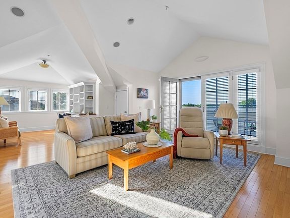 Stunning Penthouse Condo in the heart of Marblehead! A corner unit, with cathedral ceilings and three private decks offering sunny scenic rooftop views. Open concept living featuring a beautiful granite and stainless steel appliance kitchen which opens to a fireplaced living room and dining room. Surround yourself with gorgeous skylights, hardwood floors, an office area with a built-in desk and access to an outside deck. The primary suite is a show stopper with cathedral ceilings, skylight, walk in closet, private bath and a private deck. In addition, there is a second bedroom and also a lovely bathroom. Unique to this unit is a 295 sq ft loft with a third deck. This bonus space can be used for an additional private guest area, home office, play room and more. Other features include professional management, two parking spaces, private secure storage, common room for meetings, a fitness facility, common outside garden area and more! All of this and walking distance to town!