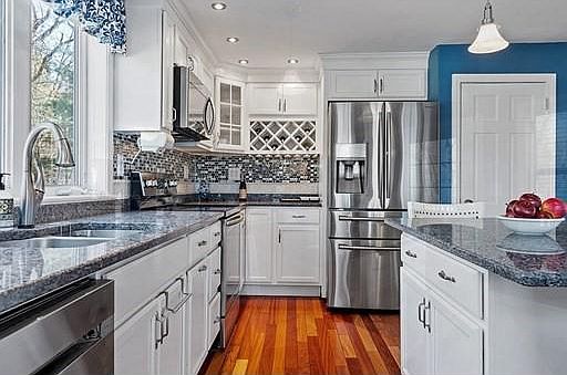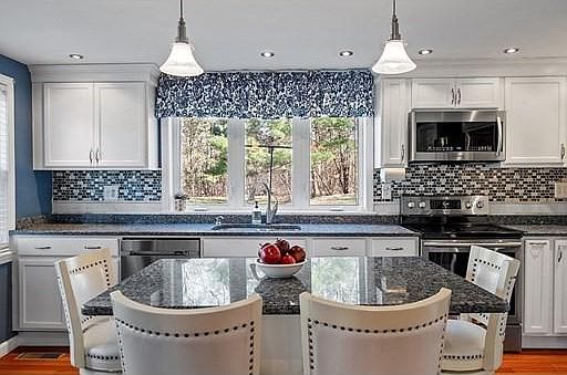 Tasteful Finishes & Smart Decisions in this 2700 sf home. Major renovation ~ Studs-in 2010! Prof landscaped & hardscaped lot w/ irrigation in neighborhood setting. Redesigned w/ Nice flow both levels! RENOVATIONS: Exterior: roof, siding, windows, deck, patio, driveway. Interior: Kitchen, 3 full baths, cherry flooring & wooden staircase. Systems: Boiler & water tank & TWO zone Central Air! 1st floor open concept w/ granite & stainless kitchen w/ triple window o/sink, tile & glass back splash, recessed pin lighting & island w/pendant lighting. Full bath with granite & wood/ tile flooring. 1st floor rounded out with 3 bonus spaces ~ Office, Laundry room w/ sink & a 2nd refrig. & optional 1st floor bedrm/den. 2nd floor w/ 2 full baths, loft area, 3 lg bedrooms & Stunning Master retreat with Soaring cathedral ceilings, picture window views of yard, W/I closet & stunning shower w/ Travertine tile, seat & on-trend glass doors. OH Su 12-2. No Appt needed for OH.