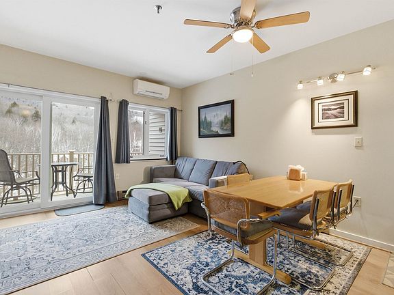 Discover your dream getaway in this fully furnished one bedroom condo that offers mountain views and a serene escape overlooking the Pemi River. Enjoy the picturesque sight of South Peak slopes right from the comfort of your bed or couch. This well designed space features an inviting open concept kitchen and living room, perfect for entertaining or simply relaxing after a day of outdoor adventure. The full bath adds convenience, while a mini split system ensures year-round comfort. As a resident, you'll benefit from a shuttle service to skiing. Additionally, this property boasts some of the best amenities in the area, enhancing your lifestyle to the fullest. Location is key- within walking distance to a variety of restaurants and swimming spots, you can truly enjoy the best of mountain living. Schedule a tour today!