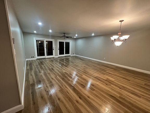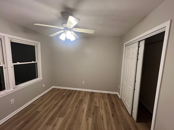 The home features a two-car driveway with a one-car garage. You'll find four bedrooms and two full bathrooms, including a primary suite with an attached full bath and a walk-in closet. Each bedroom offers a spacious closet for ample storage. Every room is newly painted and new floors placed throughout most of the home.