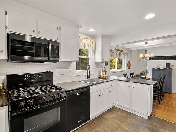 Cozy fireplaceBright vaulted family roomHardwood floorsMoody coastal vibesFully fenced backyardKitchen exudes timeless appealFlexible living space