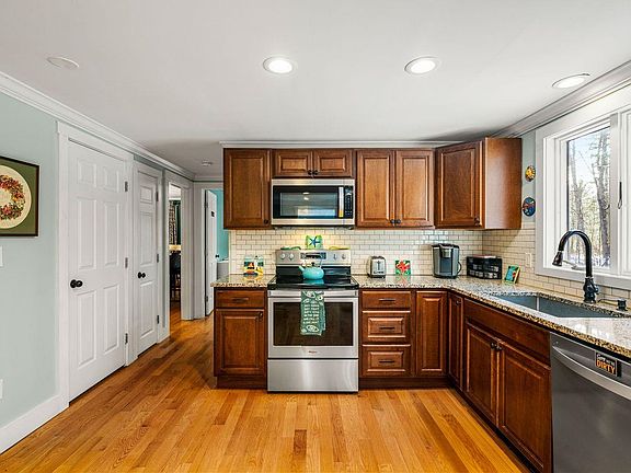 Search no more! This MOVE-IN READY three bedroom Contemporary Cape is the perfect place to call home! Nestled on the outskirts of the idyllic Amherst Village, on a serene country road, and on a 1.75 acre wooded lot, this home offers serenity, privacy, and so much more!! As you enter, you will be welcomed by the LIGHT-FILLED, INVITING SUNROOM , providing the perfect place to enjoy your morning coffee surrounded by nature. In the main living area, enjoy a SPACIOUS, OPEN CONCEPT LAYOUT featuring HARDWOOD FLOORS THROUGHOUT, an efficient Woodstove Insert to keep you toasty all winter long, a GORGEOUS UPDATED KITCHEN with granite countertops and stainless steel appliances, a First Floor Bedroom with an UPDATED 3/4 Bathroom for those seeking SINGLE LEVEL LIVING! A sizeable formal dining room with generous built-ins rounds out the main level. Upstairs you will find two liight-filled and airy bedrooms with built-ins for added storage, and a second LARGE UPDATED BATHROOM with quartz countertop and double sinks, as well as a WALK-IN LINEN CLOSET! Need more room? The WALK-OUT basement offers great potential for more living space. Outside, you will relish the tranquil expansive yard and the local wildlife from your updated wood composite deck. The quintessential New England location, in the Amherst School District, and with close proximity to Route 101 close to dining and shopping, make this home a MUST-SEE! Schedule your showing today!
