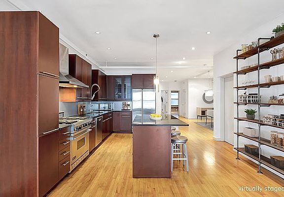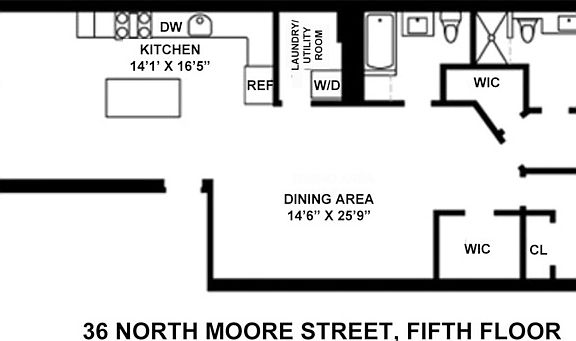 Live in a classic prewar loft on one of Tribeca's most desirable cobblestone streets. Up on the 5th floor, this smartly designed, fully renovated floor-through home has two bedrooms and two baths, and features an open layout, high ceilings, hardwood floors and original brick walls. The living room faces North, looking out over N. Moore Street with plenty of open sky. The high performance kitchen has all stainless steel appliances surrounded by yards of granite topped cabinetry, and opens to a separate dining area that could double as a roomy home office (or two). Conveniences include a washer and dryer, two wall-mounted televisions and three walk-in closets. A virtual doorman and direct, key-locked elevator provide a sense of security. Built in 1881, 34-36 N. Moore Street is a Neo-Grec (Neoclassical Revival) loft building, constructed of cast iron, brick and granite. Originally, it was the warehouse of dry goods merchant Dunbar & Wayne, later housing a printing operation, then James Rowland & Company, a grocery and butter firm. This authentic loft is available unfurnished for a one or two year lease. There is no fee to rent the apartment.