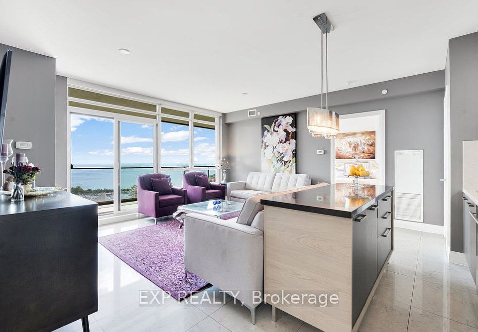 Rare turn-key opportunity at Key West Condos! This fully furnished corner suite in South Etobicokes waterfront enclave is a one-of-a-kind gem, upgraded and meticulously maintained by the original owner. Floor-to-ceiling windows flood the space with natural light and frame stunning southwest views of Lake Ontario, sunsets, and the city skyline. Professionally redesigned by the builder, the original second bedroom was transformed into a spacious formal dining room, a rare layout ideal for entertaining. The second bathroom was thoughtfully modified into a powder room, enhancing both flow and function. The original owner invested significantly in premium upgrades, including elegant chandeliers, designer light fixtures, and luxurious porcelain flooring, a timeless and rare finish that amplifies natural light and adds a refined, designer feel to the space. Two independently controlled HVAC thermostats ensure personalized comfort in each zone. Furnished with a curated mix of vintage and contemporary pieces, the suite blends timeless elegance with modern comfort. The serene primary bedroom features a walk-in closet, a private ensuite and peaceful lake views right from the bed. Step onto the expansive balcony to unwind or entertain, surrounded by open skies and calming water vistas. VIP parking on P1 next to the elevator and a convenient storage locker complete this offering. Nestled near Humber Bay parks, trails, cafes, transit, and with quick access to downtown, this is executive waterfront living at its best. Just bring your suitcase!!! This one-of-a-kind residence won't last! Book your private viewing today!