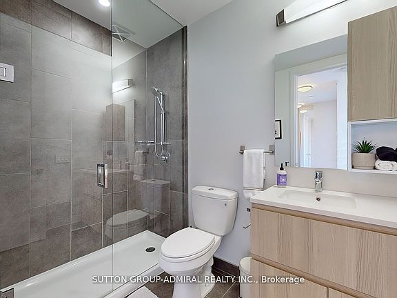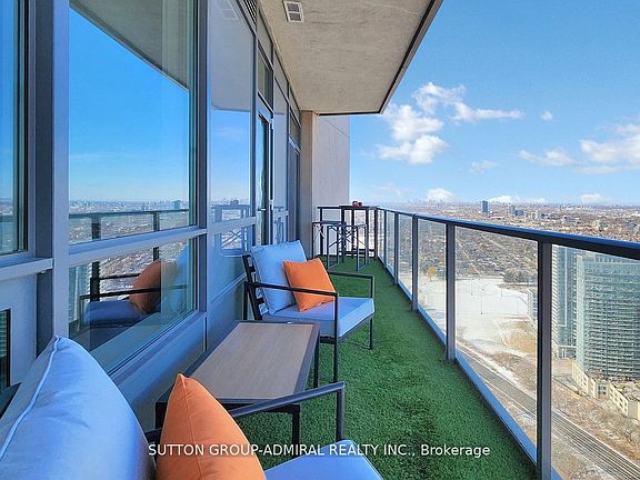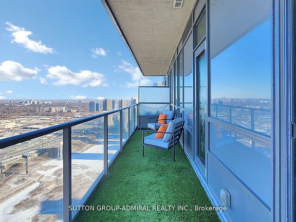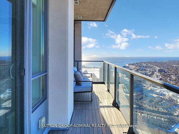 Enter into this luxurious corner unit condominium, showcasing opulent features and absolutely breathtaking, unobstructed views facing north and southwest, with stunning Lake views. This exquisite two-bedroom, two-bathroom corner unit condominium, complete with 10-foot ceilings which bring in more natural light and turn an average looking room into a stunning piece of architecture, boasts an impressive array of high-end custom upgrades, including custom blinds throughout a beautifully appointed open-concept kitchen equipped with a built-in kinetic drinking water filtration system, Quartz counters, a centre island with breakfast bar, and breathtaking city views. The primary bedroom features a custom-built wardrobe, closets, and an en-suite bathroom, while the second spacious bedroom boasts custom closet organizers. Double balconies the west balcony has custom-fitted composite tiles with views of the water, and the north balcony, with multiple walkouts, is equipped with custom-fitted fire-resistant artificial grass on floating plates. Additional features include an in-unit storage closet with custom shelving, a parking spot equipped with an EV charger, and a locker. All furniture is included except the 4 blue chairs and a few staging accessories. A comprehensive list of custom upgrades attached to listing.