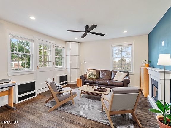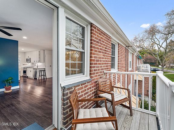 Stunning sun-filled 2-bedroom, 1-bath end unit fully renovated in 2021 with designer finishes throughout. Bright and airy with hardwood floors and incredible natural light flowing through every room from three exposures. The chef-inspired kitchen features custom cabinetry and newer stainless steel appliances, paired with a full-size, newer full size washer and dryer for true convenience. Both bedrooms offer excellent light and comfort, and the beautifully updated bathroom provides a sleek, spa-like feel. Enjoy indoor-outdoor living with a private balcony perfect for relaxing or entertaining. Additional storage includes a pull down attic plus shared basement space. Minutes to downtown Greenwich's upscale boutiques, shoppes, dining, and Metro-North train station.