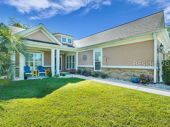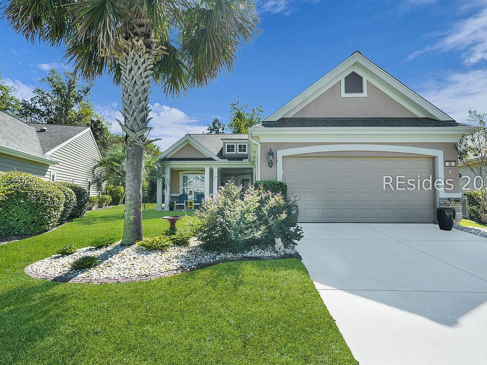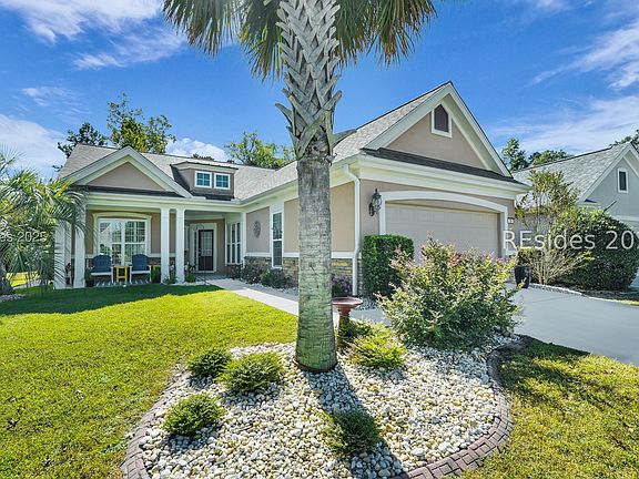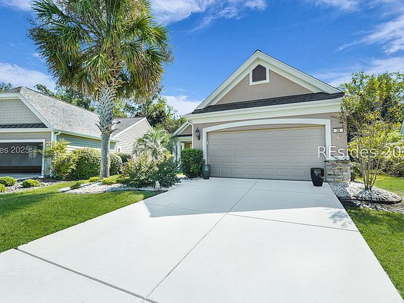 Live your best life in the premier Active Adult 55+ Lowcountry community at 36 Reedy Place in Sun City Hilton Head South! This beautifully maintained Surrey Crest model that sits on a quiet street near the rear Bull Hill Gate, offering a private wooded view and convenient access to Hwy 170. The home features 2 bedrooms + den and 2 full baths, designed for comfortable Lowcountry living. The spacious kitchen boasts a large island, abundant cabinetry with pull-outs, and an eat-in breakfast nook area. A bright great room flows into the Carolina Room and out to a lovely covered and enclosed Lanai with mini split for 3+ seasons enjoyment with an extended paver patio perfect for relaxing or entertaining.The primary suite offers a generous walk-in closet with custom shelving and a renovated bath with dual sinks, a large tiled zero entry shower, and water closet. Additional highlights include plantation shutters, custom wood valances, laundry area with office station and newer washer/dryer, and an extended garage with built-in storage. Recent updates include a newer roof (2020), 2024 HVAC system, new garage door opener, and new & nearly new stainless-steel appliances-refigerator, stove, microwave, washer, and dryer. A wonderful combination of comfort, quality, and privacy in one of Sun City's most desirable locations.