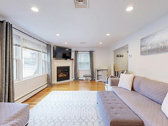 Welcome to this tastefully renovated 1st-floor home with charming curb appeal. Step into an inviting living room with a corner gas fireplace, seamlessly connected to the dining room and a stunning kitchen featuring stainless steel appliances, tile backsplash, quartz countertops, and a center island. Enjoy a sizable deck overlooking the private yard with mature trees. The 1st floor includes central air, a full bathroom, a spacious primary bedroom, and a second bedroom. The finished basement offers a workout room, laundry, a large family room, and another full bathroom—ideal for guests, an office, or playroom. Walk out to a screened-in patio and fenced yard. Updated heating & electrical systems. Upgraded driveway and walkway with patio stone. Centrally located for easy access to town center, bus stop, restaurants, parks, and schools. A dream home!