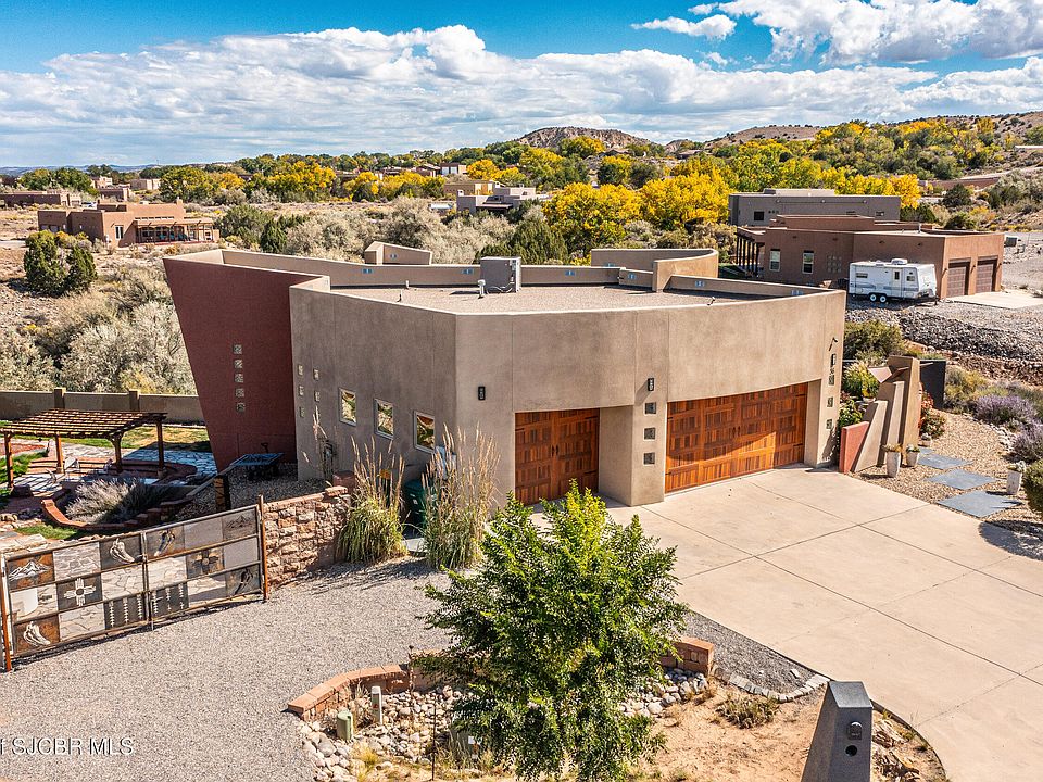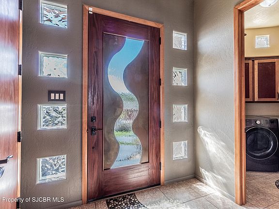 Welcome home with breathtaking views of the La Plata Mountains. Interior features include stunning solid stone countertops throughout, an abundance of natural light, and one-of-a-kind iron railings that add an artistic touch. The comfortable and versatile floor plan boasts an open living concept, complemented by an incredible floating steel staircase. A dramatic 24-foot wall with picture and clerestory windows offers stunning vistas and floods the space with natural glow, enhanced by upgraded custom lighting featured throughout the interior and exterior, creating a warm and inviting ambiance day or night.The chef's kitchen is outfitted with top-grade appliances, including an ILVE range with rotisserie, perfect for showcasing your culinary skills. The spacious master retreat features an en-suite bathroom with a jetted tub, a separate stand-up shower, custom tile work, raised sinks, and a private balcony perfect for soaking in the views. The fully finished walkout basement boasts stained concrete flooring, a second full kitchen with range, dishwasher, new Samsung refrigerator, and sink. An ideal space for entertaining. This lower level seamlessly combines comfort with 3 additional bedrooms, a flex media/office room and walk out access to the perfectly landscaped backyard.Step outside to enjoy fantastic outdoor living, complete with a hard-plumbed gas fire feature, a custom-panel fenced yard with sprinkler system, water feature, courtyard entry, and access to the arroyo below. Additional amenities include an oversized three-car garage, refrigerated central cooling, a prime location, and top-quality construction--all illuminated by thoughtfully designed, upgraded custom lighting.
