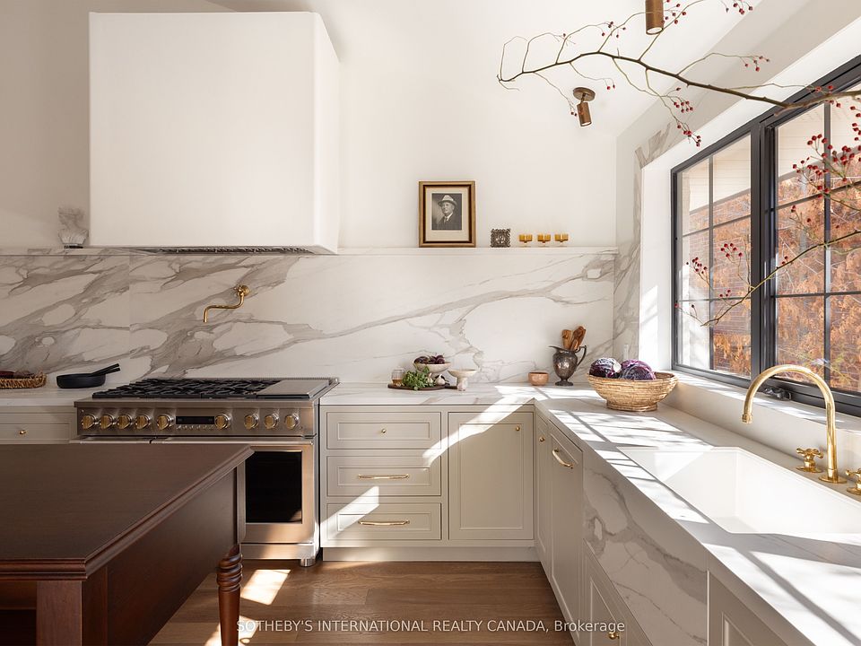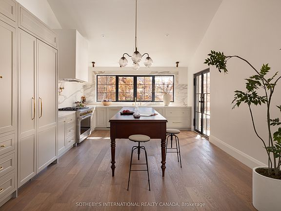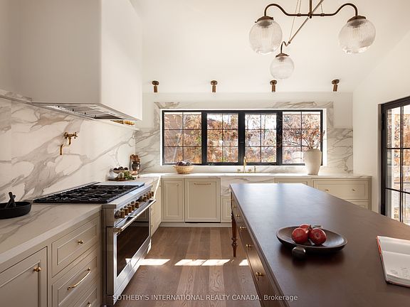 Impeccable 5-bedroom, 5-bath, residence with 2 kitchens, double laundry & walk-up basement. Approx. 5,315 sq ft of total living space. Enduring value. Purposeful design. Step through brand new custom wrought iron doors into a 13.5-ft vaulted foyer where light pours thru a skylight onto heated Italian porcelain floors. Vaulted ceilings on the main & upper levels, aluminum windows & hand-oiled European oak floors continue throughout, w/ heated floors in all baths. The custom kitchen centers on a 10-ft walnut island, face-framed birch cabinetry & honed porcelain across the counters & backsplash. Unlacquered brass hardware, a vaulted ceiling w/ a custom fixture & $150K in Monogram appliances complete the space. The family room is anchored by a Valor H6 fireplace w/ an exquisite mantle, custom built-ins & an imported English light fixture. Two bedrooms feature walk-in closets, one w/ a double, while another offers a private ensuite with Kohler x McGee & Co. vanity & hardware. Main bath incl. a 72-inch double vanity, fluted tub & oversized shower. The private primary suite on the lower level is easily accessible & feat. a 48" fireplace, large windows, terrace walkout & dressing room with floor-to-ceiling organization. Its 5-pc ensuite incl. a marble & walnut vanity, freestanding tub, water closet & porcelain slab steam shower w/ dual heads. The lower level includes a large wine cellar, family/recreation room & full second kitchen with custom birch cabinetry, leathered quartz counters & walk-in pantry. The basement feat. a fifth bed with 5-pc ensuite, gym w/ built-in speakers & large media or office space. Walk-up access to the yard (completed with permit) adds flexibility for work or guests. Outdoors, a generous space awaits your personal touch. This home offers rare versatility for guests, rental potential or exclusive living in Stonegate-Queensway, min. from shopping, fine dining, Mimico GO & 15 minutes to Billy Bishop & Pearson airport. Exceptional schools nearby.