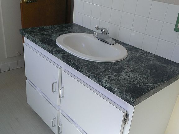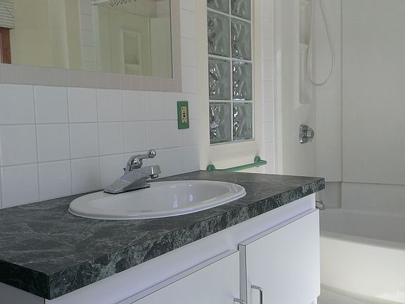 Spacious bathroom with 2 windows, one piece fiberglass tub/shower, large vanity.