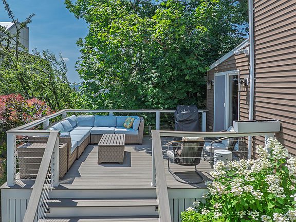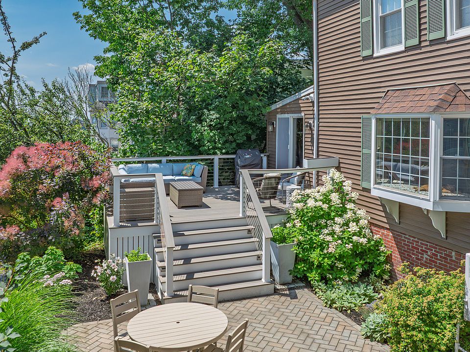 RARE Munjoy Hill single-family home with Casco Bay views from both floors! Just one block from the Eastern Promenade on a quiet, tree-lined street, this home is both charming and spacious, featuring warm architectural details and a layout that blends comfort with character. The professionally landscaped outdoor space includes a large composite deck, paver patio, and a driveway with space for two cars—an uncommon convenience on the Portland peninsula.