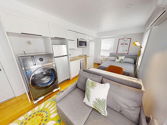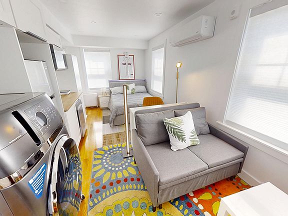 FURNISHED & BRAND NEW construction located between Brighton Center and the Green B-Line (Comm Ave). This STUDIO unit features an open kitchen/living room, in-unit laundry, high-efficiency central heat/AC, Ring doorbell, insulated walls, w/ extra sound-proofing, outdoor seating area. The kitchen offers storage, induction stove, dishwasher, microwave. Bathrooms boast luxury tiles, lighted vanity mirrors, glass shower doors, spa towel warmer. Remote control or Alexa controlled cellular day/night blinds. Rent includes WiF and in-unit laundryi; tenant pays electricity, and water/sewer. Optional driveway parking ($200) and Tesla electric car charging (extra charge). Within a 15 minute walk radius to the B-Line subway, Whole Foods, Orange Theory, Dunkin', ice cream, bodega, and many other shops/restaurants. Undergrads and grads welcome with good references. Pets are ok with approval/references. Walk Score = 83. Available now.