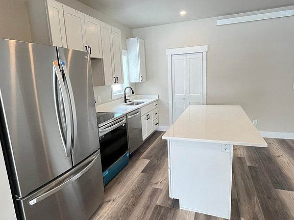 Step inside to discover the main level adorned with durable and easy-to-maintain laminate flooring, exuding both style and practicality. The kitchen showcases elegant quartz countertops, complemented by an expansive island, sleek ice-white cabinets, and state-of-the-art stainless steel appliances. Convenience meets functionality with an electric pantry and washer/dryer hookups seamlessly integrated into the main floor. Additionally, a thoughtfully included half-bathroom enhances the level of comfort and convenience.