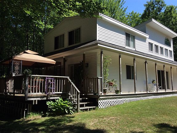Very well cared for contemporary style home, featuring a large newer kitchen with high ceilings, gas range, living area with exposed post & beams, common bath, laundry room and wrap around decks. Upstairs there's one large primary bedroom with walk in closet and private bath, and two secondary bedrooms with high vaulted ceilings. Also included is a potentially dividable 4.3 acre lot.