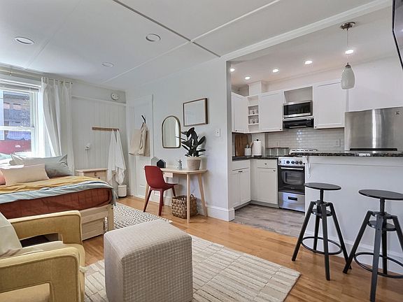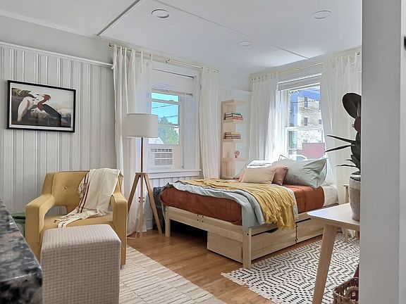 Live minimally in this beautifully renovated fully furnished studio apartment. Updated kitchen with granite countertops, breakfast bar, stainless steel appliances, subway tile back splash, granite composite deep sink. High ceilings, recessed lighting, new floors, and thoughtful decor. This is a small space, in a beautiful building on State Street. The unit has a private entrance, at the back of the building and deck shared with one other unit. Off street parking available, all utilities and WiFi are included in rent.