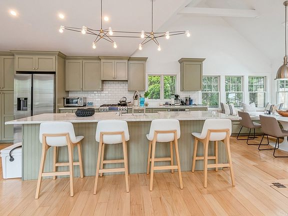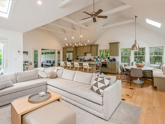 Enjoy a peaceful summer just steps to the Great South Bay & Bellport Village. This newly renovated and decorated home sits on a serene 0.75 acres on one of the most iconic streets in Bellport. The main floor features living room, kitchen and dining area, open layout and great for entertaining, plenty of light. Leading out to a beautiful 3 seasons room, screened in & perfectly decorated ready for summer evening dinners. The Primary suite with ample windows and doors leading out to the deck overlooking the lush backyard, the ensuite has a stackable washer & dryer. The top floor bedroom has cathedral ceilings, perfect for guests. The ground floor has its own lounge area, guest bedroom with full bath. Central AC. 2 car garage for storage, heated IG Pool, above ground Jacuzzi, outdoor shower, BBQ area, extensive plantings, lots of outdoor furniture to enjoy your retreat, Private beach rights also.