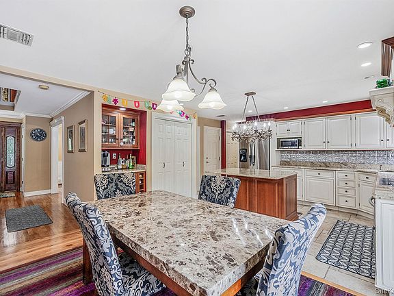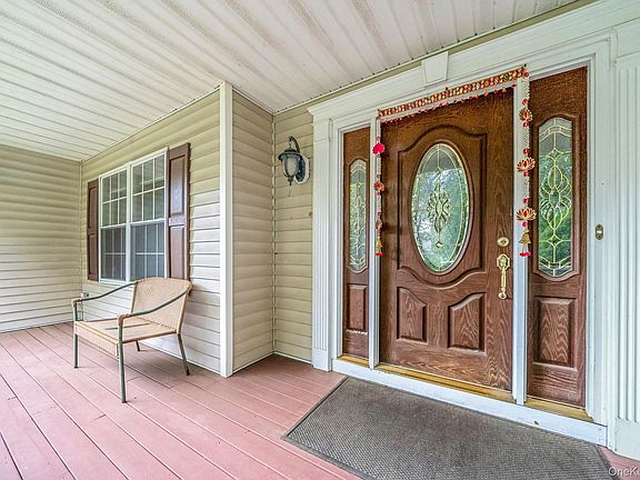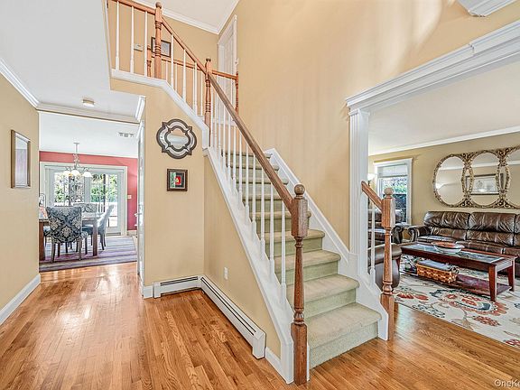 Saint James Colonial in Smithtown Schools, built 1998, on a quiet cul-de-sac. A grand two-story foyer leads to formal living and dining rooms, a fireplace family room, and an eat-in kitchen with granite countertops. Off the rear, a glass-wrapped sunroom overlooks the backyard and opens to a large composite deck. Main level highlights include hardwood floors, powder room, and laundry. Two-car garage with electric-car charger, 9-zone in-ground sprinklers, central air.
