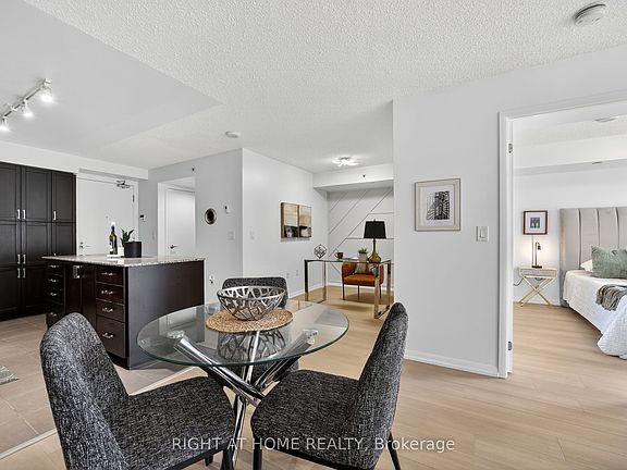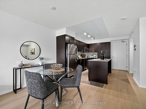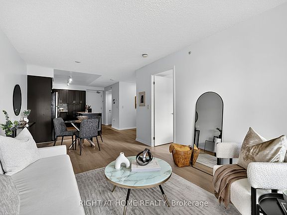 Watch Property Video - A Must! Newly renovated with vinyl floors, freshly painted, and a stunning custom designed accent wall in the den. Enjoy the inviting kitchen with a large island perfect for a comfortable cooking space and entertaining guests. The open concept layout meets luxury with a gorgeous south facing terrace overlooking the outdoor pool. Live the resort lifestyle with exceptional shared amenities including a heated outdoor pool, gym, and rooftop terrace with BBQs. Steps to TTC, Columbus Community Centre, playground, shops and grocery stores. A short drive to Yorkdale Mall, Costco, and easy access to hwy 401. Includes 1 Parking and 1 Locker for added storage and convenience.