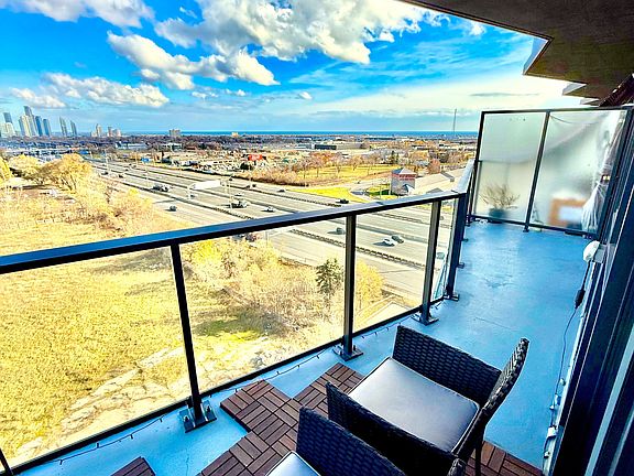 Modern and bright 2-bedroom + den condo at Thirty Six Zorra with unobstructed views of the lake and city. This unit offers a functional layout with an open-concept living and dining area and floor-to-ceiling windows that bring in plenty of natural light and 753 square feet of indoor and outdoor space.. The kitchen features an upgraded island, quartz countertops, and stainless steel appliances. The primary bedroom includes an Ensuite with a glass walk-in shower. The second bedroom is well-sized, and the den is ideal for a home office or extra space. Step onto the BIG balcony where you can enjoy sunrise and take in the wide, open views. The building provides 24/7 concierge, a gym, outdoor pool, pet spa, party room, and more. Conveniently located near the Kipling GO Station, major highways, grocery stores, shops, restaurants, and the waterfront-perfect for modern and easy city living.