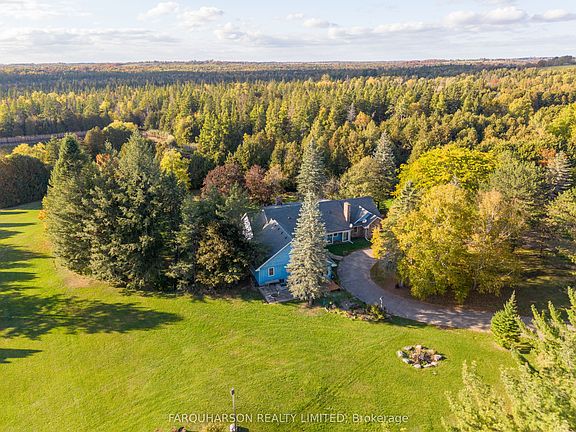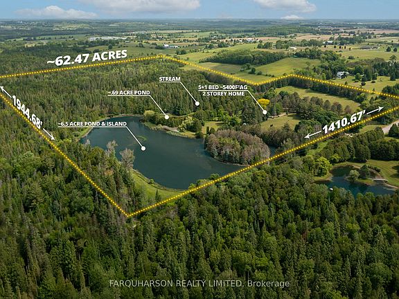 Discover timeless charm, modern comfort, and breathtaking natural beauty on this extraordinary 62-acre one of a kind retreat. This rare offering features over 7 acres of tranquil ponds including one with its own private island surrounded by mature trees, manicured grounds, and a peaceful, babbling stream.A long, winding driveway welcomes you to an impressive 5,400 square foot two-storey residence plus a partially finished basement, offering 6 bedrooms and 7 bathrooms. Thoughtfully designed with multiple walkouts, this home captures panoramic views of the lush landscape and serene waters from nearly every room.Inside, you'll find a blend of elegance and functionality. Two main floor bedrooms, including one with a walk-in dressing room and private ensuite. Three additional bedrooms on the second level, along with two fully renovated bathrooms featuring heated floors, an upper-level recreational room with a wet bar and gleaming hardwood floors throughout.The lower level offers flexibility with a separate entrance, bedroom, living area, and kitchenette perfect as a guest suite or in-law setup.Whether you're canoeing across the pond, reading beside the stream, or casting a line for an afternoon of fishing, this estate is a true nature lover's paradise.Located on a quiet road just 8 minutes from Mount Alberts shops and dining, and only 20 minutes to Highway 404 and all the amenities of Newmarket this is the perfect blend of rural tranquility and modern convenience.