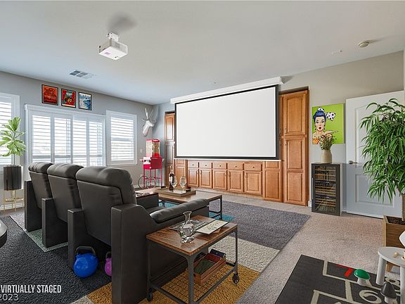 This exceptional five-bedroom, luxury residence in Southeast Las Vegas is situated on a half-acre home-site with RV parking and hookups. Enter the home to see the curved staircase, 18"x36" glazed porcelain wood look tile flooring downstairs, and shutters throughout. The gourmet kitchen features plenty of custom cabinetry for abundant storage options, stainless steel appliances, Michelangelo Blue Quartzite counter-tops with full back-splash, a Thermador range with two ovens plus additional double wall ovens, and an under-mount sink. The generous primary bedroom is downstairs and features a private staircase to the retreat with door to the oversize balcony spanning the full width of back of the home. The primary bathroom suite presents separate vanities, walk-in closet, a soaking tub, and separate luxury shower. The expansive backyard with huge, covered patio is a blank slate with room for a pool or whatever your heart desires.