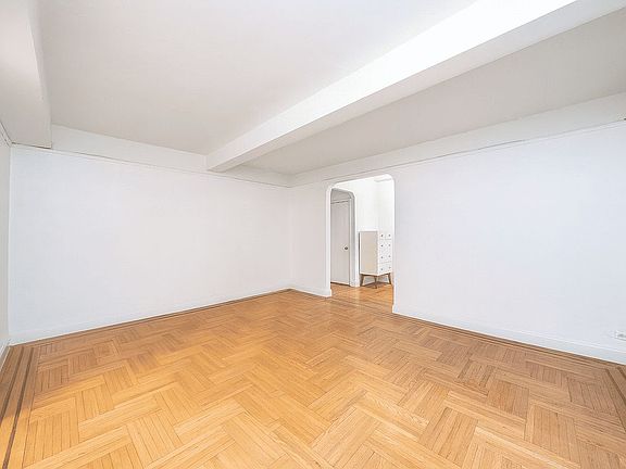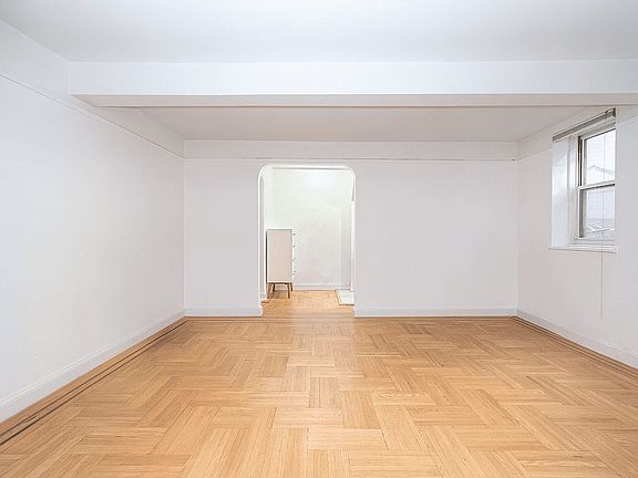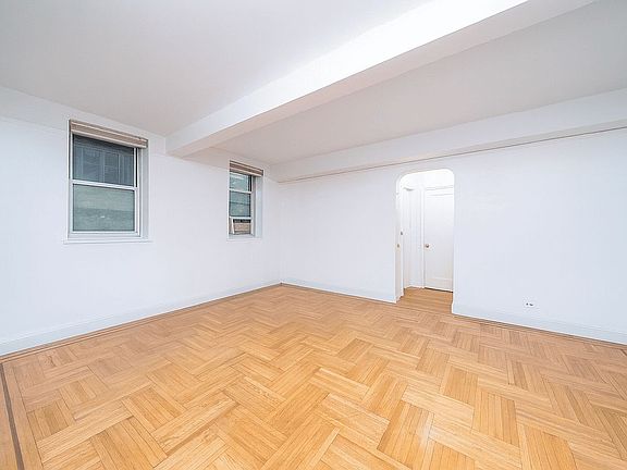This beautifully renovated residence with its appealing floorplan is more than a typical studio. A giant main living area is framed by arched entries on opposite sides, one leading to the dining, kitchen, and closet areas, and the other to the bathroom and more closets. Gorgeous parquet hardwood floors with walnut details gleam under the natural light from oversized windows, while ceiling beams add another striking architectural touch. There is ample room to design this central living/bedroom area however you choose, including the use of standing screens to create privacy and separation.