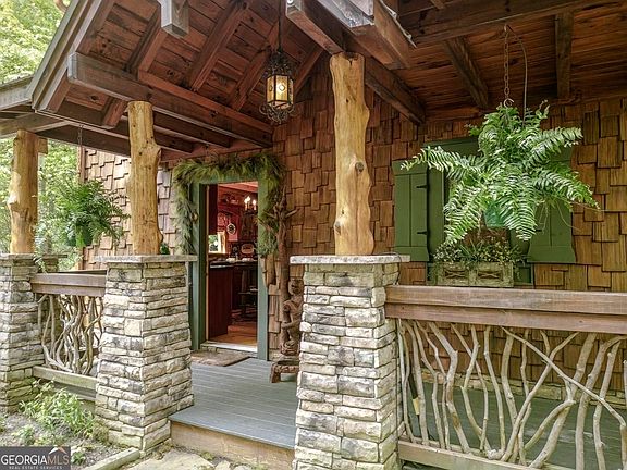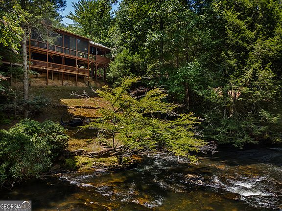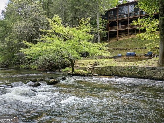 Welcome to Ellijay, Georgia; the place of "many waters," and the cabin at 360 Cascade Point on the Ellijay River is no exception. As the community name implies, "River Bend" is the spot where the river starts to bend along its 15-mile journey before forming the Coosawattee River. Perched along one of the widest sections of the river with approximately 175 ft. of frontage with great, swift-moving, noisy whitewater. Living on the river provides many outdoor activities: fishing for trout or striped bass, canoeing, kayaking, tubing, or finding the perfect swimming hole. However, maybe the best activity is just sitting around the firepit enjoying the timeless soundtrack of the majestic river. Elegance and style are present throughout this 3 bedroom, 3 full bathroom cabin with the primary bedroom on the main level and a powder room, washer & dryer-large kitchen with abundant cabinet and counter space. Walk-in pantry with adjacent dining area. Great room design with beamed ceiling, stacked stone fireplace, French doors with transom windows all leading out to the back porch to take full advantage of the river. The second floor offers a Jack & Jill ensuite. The finished terrace level offers a family room, additional sleeping quarters, and access to the lower 568 sq. ft. deck and workshop area. The main level deck offers 1523 sq. ft. of unmatched outdoor and entertaining space. Featuring a covered, fully equipped bar and grill area with gas grill, separate side burner for frying or boiling, warming drawer, under counter refrigerator, hot & cold running water at workstation sink & free standing cedar ice chest for ice or frozen items, plus an adjoining closed porch that includes The Porch Life 365 Enclosure System. It is an inviting space filled with warmth and character and the versatility to enjoy your morning coffee or a nice glass of wine in the evening or host a large dinner party or a family gathering while enjoying the sights and sounds of the river. The cabin's exterior offers a level parking area with additional community parking across the road. Cedar shake siding, newer durable metal roof, wood shutters, planter boxes, irrigation system, and landscaping lights. Stacked stone pillars with full cedar log accents, Generac Guardian 22 kW whole house generator, large pit, and a private access easement for convenient access to the river. Being sold mostly furnished with custom one-of-a-kind pieces, antiques & upscale decor. Welcome home to 360 Cascade Point!!