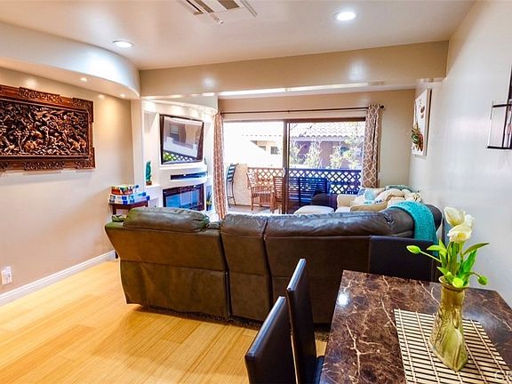 Spectacular 1 bedroom, 2 bath, Bahia Vista Condominium. Highly upgraded and completely remodeled and all permitted in 2018. This property is completely furnished and is currently a very successful rental that has a one time transferable short term rental license thru the City of Avalon. Bright and cheerful throughout with lots of little extras, from air conditioning, newer appliances, stone finished baths, granite counter tops, as well as Bamboo floors. This corner unit boasts a large outdoor patio that extends from the living room to the bedroom and views from the hillsides to the extensive gardens. Entry area, living room, dining area, and Master bedroom all have beautiful Bamboo floors. The large living room has a faux fireplace, with stylish hearth and mantel, large flat screen TV, and plenty of room for the family. The kitchen boasts stainless steel appliances, travertine tile floors, and a great breakfast nook. Off of the kitchen is a laundry closet with stackable washer and dryer, and storage, as well as a separate stylish bathroom with granite counters and vanity, tub/shower and stone finishes. The large master bedroom has a king size bed, large flat screen TV, two large windows and with views of the surrounding hillsides and gardens. Enter the ensuite master bath through a sliding barn door, to double mirrored closet and sink vanity, also a large walk in shower with stone and tile finished. Great lighting throughout and lots of curved surfaces makes this a designers dream.