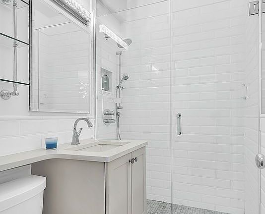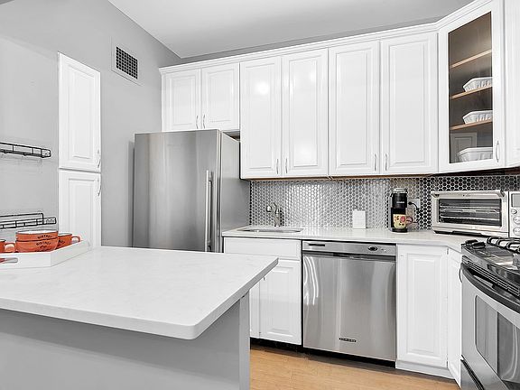 Bright southern exposureGreat natural lightStainless mosaic backsplashSleek countersLarge walk-in showerPretty baseboard moldingsPlenty of cabinet storage