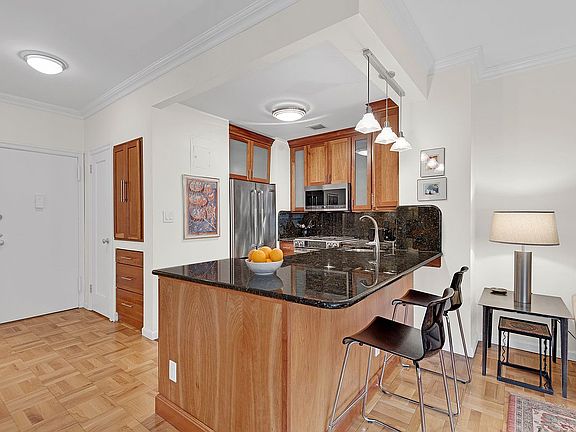 A 21-foot open concept living room has plenty of space for a dining area and/or home office. The fully outfitted kitchen is open to the living room and features a breakfast bar for casual dining and entertaining. There is plenty of cabinet and pantry storage, granite counters, and stainless appliances including a dishwasher and built-in microwave. Beautifully appointed, the apartment features wood floors and pretty crown moldings. Both baths are in excellent condition, and the powder room allows for privacy in entertaining.