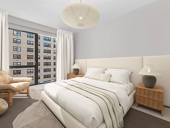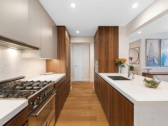 A smoked walnut entry door and white oak foyer welcome you to this luxurious residence featuring two bedrooms and two baths. Designed by SHoP Architects, this 1,393 SF home features white oak floors and floor-to-ceiling windows offering treeline views, a split floor plan and a sun-filled eastern exposure. The custom kitchen designed by Clodagh for Citizen360 features smoked walnut cabinetry, Persian White Pulido Porcelanosa slab countertops and backsplash and an island with a waterfall edge. Appliances include a stainless steel Bertazzoni range, a Liebherr refrigerator, and a Bosch dishwasher.