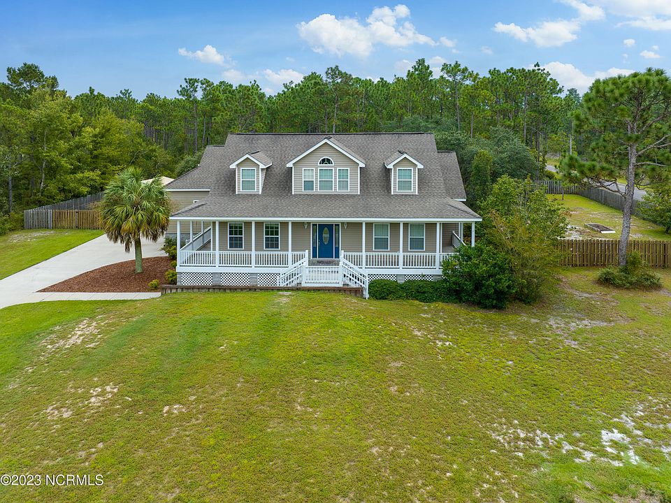 Welcome to your relaxed lifestyle in this sprawling home on an almost 1 Acre fenced lot. This home offers everything you have been looking for: Bright open kitchen with both formal dining room and a cozy breakfast nook, adjoining the spacious living room with vaulted ceiling and gas-log fireplace. The main level is completed with the primary bedroom suite. And upstairs there are 2 more bedrooms and another full bath, plus a multi-purpose bonus room. This home also offers so much outdoor living space. There is a wrap around front porch, and around back there is a lovely screened porch leading to the large deck with steps down to a grilling/entertaining area...and a HUGE fenced back yard. And with a whole house generator, you will never be without power. Recent updates include one new heatpump in 2023(and the other one is only 6 yrs old), new stove and new garage door opener. Plenty of room for all your family activities. Don't miss this wonderful home in Boiling Spring Lakes, so convenient to downtown Southport, the beaches, Wilmington and so much more!