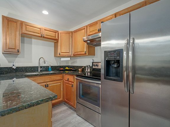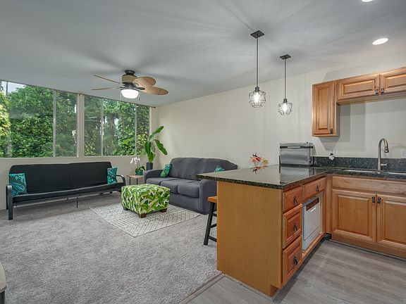 The 2nd bedroom has a large closet, ceiling fan and its own 1/2 bath across the hallway. Both bathrooms have been completely repainted, toilets rebuilt and new shut off valves and new water lines have been installed throughout the unit. The kitchen features granite countertops, a side by side refrigerator with filtered water and ice dispenser, electric stove, sit up bar peninsula and even a half size dishwasher! All new hinges and hardware for all doors and cabinets. The pool area which has recently been refreshed is great for sunbathing, cooling off and entertaining guests. All new grounds lighting and security system have recently been installed. Just a short walk to Hilo town and Bay front.