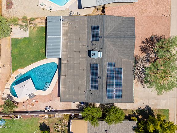 The backyard is perfect for Arizona living, featuring a pristine pool, a new covered patio, perimeter fencing, and gutters—ideal for entertaining or relaxing year-round.