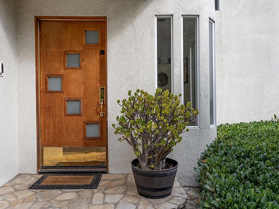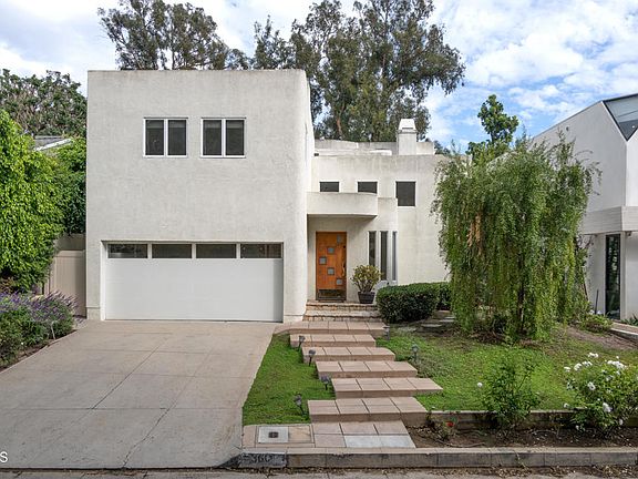 Secluded in the heart of Brentwood, this Art Deco Modern-style home was extensively remodelled & enlarged in the early 90's, features 4 or 5 bedrooms and 3.5 bathrooms. It offers spacious living areas filled with natural light, combining ample windows while maintaining privacy. As you enter, the home unfolds with high ceilings, prominent lines, a charming balcony, and a glimpse of the backyard. Each room is generously sized, with the living room showcasing lofty ceilings, plenty of windows, stylish design, and a dual-sided fireplace shared with the dining area. The dining space is enhanced by ambient lighting, a stunning chandelier, and a beautiful staircase with a balcony. From there, you flow into the kitchen and family room, which leads to the backyard. The large kitchen offers granite countertops, dual sinks, a spacious island, a breakfast bar, and a walk-in pantry. The cozy family room is an ideal spot to relax and take in the yard. The backyard boasts lush plants, ample space for entertaining, and with the addition of a lawn, it will complete the setting. Upstairs, an elegant stairway and landing overlook the lower level to three bedrooms and an office. All bedrooms are spacious and well-separated. The primary suite features high ceilings, a walk-in closet, a fireplace, and a large bathroom. Upstairs also features two more bedrooms and an office/5th bedroom, which includes a fireplace and a great view of the neighborhood. In addition, the home offers solar panels, a backup battery, and an electric car charger.