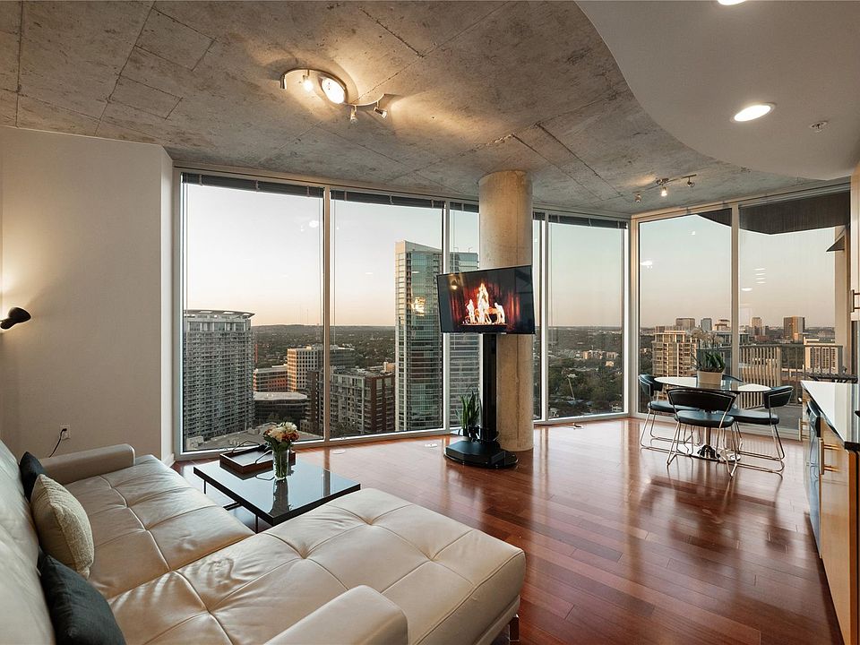 Welcome to the skyline. // Sitting high above the heart of downtown Austin, Residence #2610 at 360 Condominiums captures the essence of modern urban living: bold architecture, wide-open space, and skyline views that never stop. Situated on a corner of the building and framed by walls of glass, this one-of-a-kind floor plan seems to float above the city with panoramic vistas, from the glittering towers of downtown to the horizon. // Inside, industrial blends with natural: exposed concrete ceilings/walls, rich Brazilian cherry hardwood, granite counters, honey-toned wood cabinets, stainless steel appliances, and a striking black subway tile backsplash that reflects the caramel sunset glow. // The open-concept living/dining room opens to a private balcony, the perfect perch for morning coffee or evening wine while the city lights begin to sparkle. The spacious bedroom features oversized windows and direct access to the bath, complete with a soaking tub. // 360 Condominiums offers residents an exceptional amenity suite: 24-hour concierge, resort-style pool and sundeck, outdoor grill, theater room, gym, club lounge, and dog-run, all within a controlled-access environment. Located in the vibrant 2nd Street District, the building is steps from Trader Joe’s, Whole Foods, and a curated mix of restaurants, cafes, and cocktail lounges. // With a reserved, gated garage space next to a column and easy access to major connectors, 360 #2610 delivers the perfect combination of convenience, privacy, and breathtaking views, making it one of downtown Austin’s most compelling one-bedroom offerings.