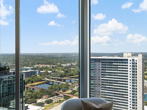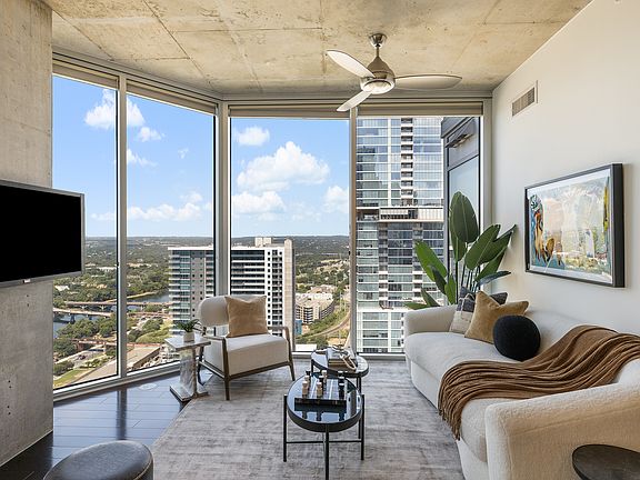 Experience elevated downtown living in this highly sought-after southwest-facing corner unit. Perched on the 32nd floor of the iconic 360 Condominiums, this residence features floor-to-ceiling windows in every room and two private balconies, offering spectacular views of Austin's city skyline, Lady Bird Lake, and beautiful sunsets over the Texas Hill Country. This coveted 2-bedroom, 2-bath corner end delivers some of the best vantage points in the entire building, with a perfect blend of urban energy and natural beauty.