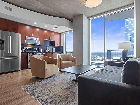 Beautiful west-facing, fully furnished condo on the 39th floor of 360 Condominiums with panoramic views of Downtown Austin and Lady Bird Lake! This updated 2 bed / 2 bath residence showcases floor-to-ceiling windows, wood flooring throughout, and designer-selected finishes. The primary suite offers a walk-in closet with custom California Closets finishes, blackout shades, dual sinks, walk-in shower, and a private balcony. Additional features include stainless Whirlpool appliances, custom cabinetry and furniture, a built-in banquette with storage, wallpaper accents, electric sunshades, and window tinting. Offered fully furnished with two great, reserved parking spaces near the elevator on P5. Residents enjoy luxury amenities including two dedicated 24-hour concierge, resort-style pool deck with grilling stations, fitness center, owners lounge, and dog park. Unbeatable location—steps to Lady Bird Lake, Hike & Bike Trail, Trader Joe’s, Whole Foods, 2nd Street District, and all of Downtown Austin.