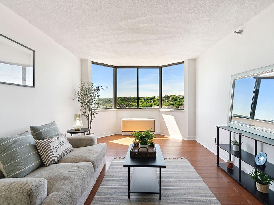 Excellent opportunity to own a condo within walking distance of everything you need & enjoy! Walk to dinner with friends, happy hour or coffee, big events at Xcel Center, shopping, AND trails and bike paths along the Mississippi River! Gorgeous views from your bay window of Saint Paul's Cathedral, Summit Ave mansions & treetops for miles! Walk up to the secured building through the green courtyard with trees & peaceful setting. Inside, this unit is very well maintained with plenty of natural light, nice flooring, and bright refreshing space! There's space for dining, a large bedroom with good sized closet, and a cute updated bathroom! In-unit laundry here is a huge bonus, plus an actual laundry room tucked away near the unit front door! There is garage parking available to rent for $108/month! This unit could be your oasis in the sky in the heart of Saint Paul!! Or a great investment opportunity!