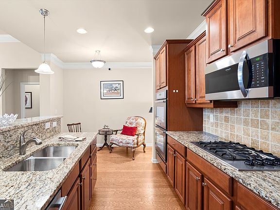 Precious Cottage, meticulously maintained, in a highly desirable area for active adults, filled with natural light and defined by cozy living spaces. The oversized primary bedroom at the back of the home offers a private retreat with a lovely view of the patio, room for a sitting area, and a spacious ensuite featuring double vanities, a shower, a separate accessible water closet, and a generous walk-in closet. The living room, centered around a cozy fireplace, provides a welcoming space to relax and direct access to the patio. An open floorplan is with kitchen featuring an island, stainless steel appliances, and an eat-in area, make this home perfect for both entertaining and everyday living. A beautiful open dining room with tray ceiling and wainscoting. Two secondary bedrooms, each with cathedral ceilings and large windows, are ideal for guests, an office, or a hobby room. There's also a ready-to-finish bonus flex room upstairs for additional space if needed. Ample closets, abundant storage, and a generously sized two-car garage add to the home's convenience. Located directly across from Lost Mountain Park, this home offers a central location close to Wellstar, Walgreens, Publix, recreation, restaurants, worship, and shopping-Target, Starbucks, Sprouts, Avenues, ice cream shops, and charming local boutiques are all nearby.