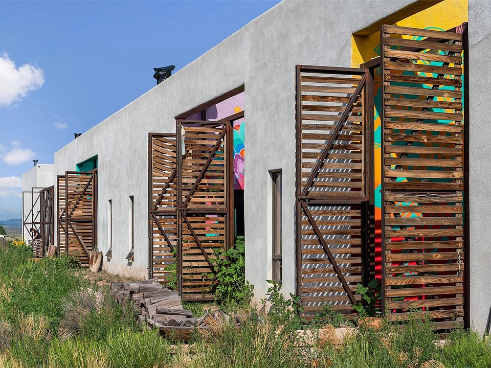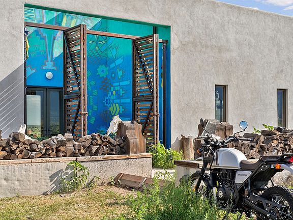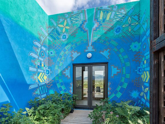 360 Sunshine, an iconic artist property that is exquisitely designed, sits on five acres in Sunshine Valley of Northern New Mexico. Three exterior murals strategically placed in each courtyard by Lynnette Haozous an indigenous artist- her work features Apache, Dine', andPueblo designs. The breathtaking views of Ute Mountain on the north side of the home and colorful abstract symbolism in each mural alcove that face south are truly one of a kind. These Murals give 360 Sunshine so much beauty and the front door is a mountain portal.The linear property contains a collection of wind protected courtyards. The architect and seller of this stunning home thoughtfully designed its vast living space for versatility including a working studio for engaged artists. The second bedroom currently be used as a studio space with east access to outdoor living with proximity to airstreams and deck platforms. Bonus washroom, with another washer/dryer with zen finishes and external access. A real perk for guests staying in the romantic airstreams overlooking Ute Mountain. The main house is a spacious 3100 sq. ft, two bedroom and one bath. The well-appointed guesthouse is 940 sq. ft, a spacious one bed one bath. A spiral staircase leads to a rooftop deck boasting stunning 360 views. In cohesion, the main and guest house shares the samedeck. Both have striking large wood and steel doors that are their own work of art. Fourteen-foot ceilings, natural light from all angles,360 Sunshine is the perfect place for your art, unique pieces, and personal inspiration. Cozy in the winter with radiant floor heating throughout, passive solar design, electric wall heaters and three wood burning stoves. A central main wood burning fireplace in the living room open kitchen floor plan is a center focal piece of the home's design. Custom concrete countertops in both the main and guesthouse kitchens. Form, function and minimalist beauty define the concrete work in both kitchens and floors throughout. Frame construction with four inches of rigid foam insulation that assists in temperature control from season to season. Built in 2018, fiberoptic high speed internet to the property is supportive for future endeavors for this new owner, perhaps running your own artist residency, retreats, long or short-term rentals. A dream property for an artist or entrepreneur seeking balance inspired by their home life. If anything about this creative lifestyle piques your interest, standing in this home will give you the full experience of its unique beauty and future possibilities. You will want to see it for yourself, it's magnetic.