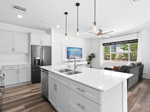 Discover modern living in this practically brand-new, energy-efficient with OWNED SOLAR, 4-bedroom, 2.5-bath townhouse at 360 Sweet Place. Walking distance to the pool, dog park, clubhouse, resident mailbox, and visitor parking, Located just off I-15 and CA-76 and built in 2022, this 2-story end-unit townhouse shares only one wall with its neighbor, offering enhanced privacy and abundant natural light. With the PAID-FOR SOLAR PANELS, you’ll enjoy significant energy savings in this move-in-ready home. The open-concept downstairs features spacious living, dining, and kitchen areas, with a large island, stainless steel appliances (stove, oven, microwave, dishwasher, refrigerator negotiable), and a convenient half bath, perfect for entertaining and daily living. Upstairs, four well-appointed bedrooms include a primary suite with a walk-in closet, ensuite bath with double sink vanity, a full guest bath, and a washer/dryer closet. Smart home capabilities like Alexa controls, automatic bathroom lights, and dimmer lights enhance the modern experience, complemented by central air conditioning and heating. This home offers access to a vibrant community with a large pool, BBQs, parks, trails, and playgrounds. The attached 2-car garage with direct access to the home provides convenience and protection from the elements for both occupants and vehicles. This end-unit townhouse is ideal for all, especially those seeking a low-maintenance, contemporary lifestyle in North County San Diego.