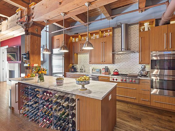 Absolutely Stunning, Renovated Brick & Timber Loft at The Sexton! This massive 2 bed, 2 bath home combines authentic loft character with thoughtful, high-end updates throughout. Soaring ceilings, exposed timber beams, and hardwood floors set the stage for an open, inviting layout, complete with a private balcony to enjoy a cup of coffee and some fresh air. The custom chef's kitchen is anchored by an oversized island with updated quartzite countertops and backsplash, and top-of-the-line appliances including a Wolf cooktop with double oven, Sub-Zero refrigerator, Thermador microwave (2019), and Bosch dishwasher (2016). A hall closet has been transformed into a pantry with custom built-ins, while the laundry room features its own custom closet for maximum storage. The spacious primary suite offers new custom doors, a closed wall for privacy, and a walk-in closet. The luxurious spa bath boasts double sinks, Kohler body spray shower with steam and rain features, and an air-jet soaking tub. The second bath was upgraded with a glass shower door and striking Carrara marble finishes. Additional upgrades include: new heating/AC and humidifier (2017), new thermostat (2025), custom blackout shades on six oversized windows, and a beautifully redone fireplace with modern glass rock detail. The Sexton is an amenity-rich building with 24/7 door staff, cleaners, package room and fitness center. Enjoy this special home in a solid building located steps away from East Bank Club and River North's best dining, shopping, and entertainment, plus easy access to 90/94. Heated garage parking is available for purchase ($35K).