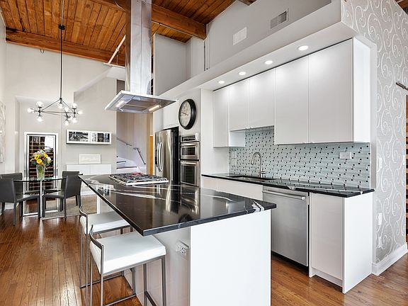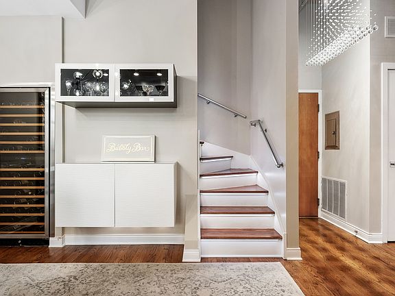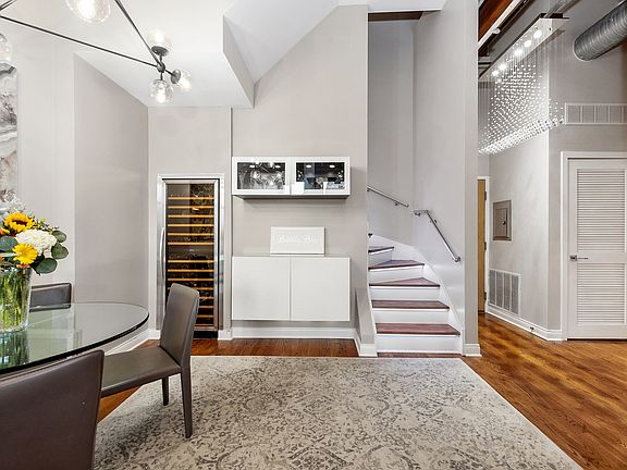 Remarkable representation of a true loft in this modern duplex penthouse with over 1500sf of living, originally a 2 bed/2bath, with a private rooftop terrace and main level balcony. Custom composition of oversized cambria quartz island, high gloss soft close cabinets, textured glass backsplash, soffit illumination, 36" Wolf 5-burner rangetop and hood, oven and microwave duo, Bosch dishwasher, textured floating bar cabinet, built in stainless steel framed 151 bottle wine cooler, chef and entertaining detail in mind. Entryway chandelier, dynamic LED staircase lighting, hardwood floors throughout both levels, exposed brick with 14' timber ceilings, floor to ceiling windows, balcony off living area, California Closets floating media center with shelves, California Closets wall unit with queen size murphy bed with full Serta mattress (bedroom wall may be easily reconstructed), every closet and walk-in complete with Elfa closet system, baths adorned with lighting and chandelier, upper level dual vanity. The upper level includes a full wall unit of storage with 3 panel designer sliding doors from The Sliding Door Company, full size stackable washer and dryer externally vented, custom shelving, refrigerator and freezer for outdoor entertaining, complete with storage for patio furniture cushions. Rooftop terrace with stone and glass firepit with direct gas line so you can enjoy the outdoors through November in Chicago's River North with a little bit of history at the Sexton Lofts. Large full storage locker with a door and garage parking + $25K. Full amenity building, 24hr door staff, fitness center, courtyard, bike storage, and dry cleaners. Ultra Urban, ultra stylish, art and design district, Merchandise Mart, just north of the Chicago River, walk the riverwalk with award winning dining, shopping and magnificent city views, East Bank Club, accessible to downtown, commute and transportation.