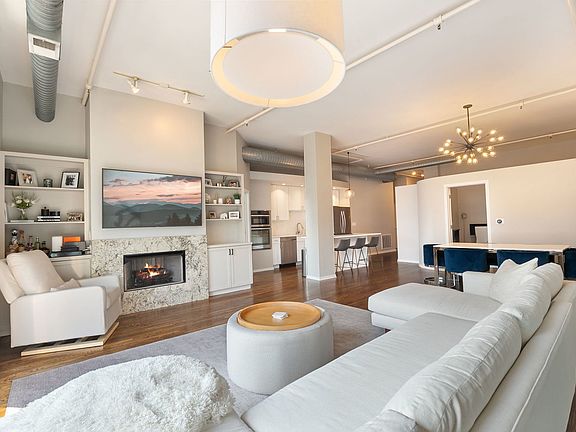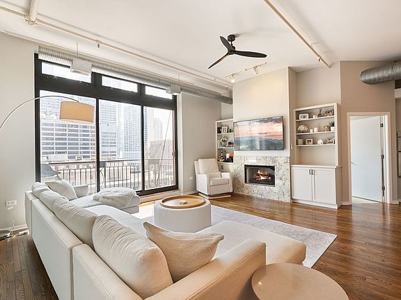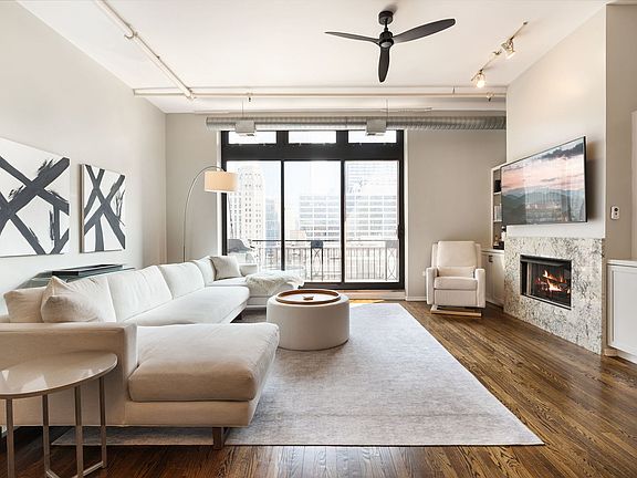 Welcome to The Sexton, a premier full-concrete loft building. This stunning 2BD/2BA residence offers nearly 1700 square feet of living space and an expansive open-concept layout with soaring 11' ceilings, abundant natural light, exceptional privacy, and unobstructed striking south-facing views from the sought-after tower tier. The recently redesigned chef's kitchen is designed for both style and function, featuring quartz countertops, a large island, striking herringbone backsplash, stainless steel appliances, and gas cooking. The spacious, fully enclosed primary suite includes a huge walk-through closet and a luxurious bathroom with dual sinks, new shower, and new soaking tub. The king-sized second bedroom provides plenty of versatility for guests or home office. Additional highlights include beautiful oak hardwood floors, gas fireplace, wall of built-ins, sunny southern exposure, private balcony, and stunning city views. One premier parking spot, directly beside the elevator, included in purchase price. Full-amenity building with 24-hour door staff, sun deck, fitness center with brand-new equipment, on-site dry cleaners, and a large 5 X 7.5 enclosed storage unit. Unbeatable River North location-just steps from East Bank Club, Easy Loop access, Surrounded by top dining, shopping, and entertainment options, this home blends luxury and convenience in one of Chicago's most vibrant neighborhoods.
