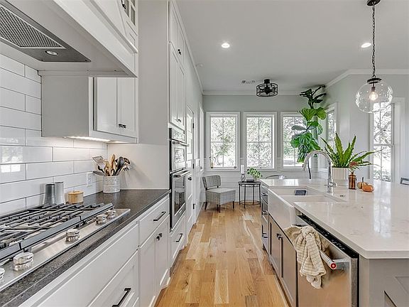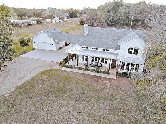 Start your day where 72nd Ave ends in this modern farmhouse built by a long-time Norman builder in 2016 and nestled on 5.25 acres. The dead-end location eliminates through traffic, creating a secluded sanctuary just 7 miles from the University North Park shopping area.The welcoming wrap-around porch spans the front of the house, offering a relaxing outdoor living space with cedar beams that contrast beautifully with the white siding. Step inside and your eye is immediately drawn upward to soaring vaulted ceilings articulated with exposed wood beams. Large picture windows topped with transoms flood the great room with natural light throughout the day, while light-stained solid hickory flooring—prized for its exceptional durability—gives the space a warmth that only wood can provide. The floor-to-ceiling fireplace serves as a striking focal point, combining rustic whitewashed brick with the clean lines of horizontal shiplap. The kitchen has an expansive island with seating, white shaker cabinets, subway tile backsplash, stainless steel appliances, built-in gas cooktop, and a large walk-in pantry. There's room enough for both a large dining table and breakfast table.The master bedroom features a cathedral ceiling that creates an open, airy feel, with double French doors opening onto a private patio. The ensuite bathroom includes a jacuzzi tub and separate shower, two separate vanities, a toilet room, and a closet that connects directly with the laundry room—making laundry day effortless. The flexible floor plan accommodates four bedrooms or three with a study. Two bedrooms upstairs each have their own private vanity and share a toilet and shower between them. The separate guest house (576 sq. ft. not included in 2625 Sq. Ft. measurement for main house) the farmhouse vibe with its own large covered front porch wrapped in grape vines, plus a full kitchen, bathroom, bedroom, and two lofts—perfect for visitors, family, or rental income. OEC Fiber is available!