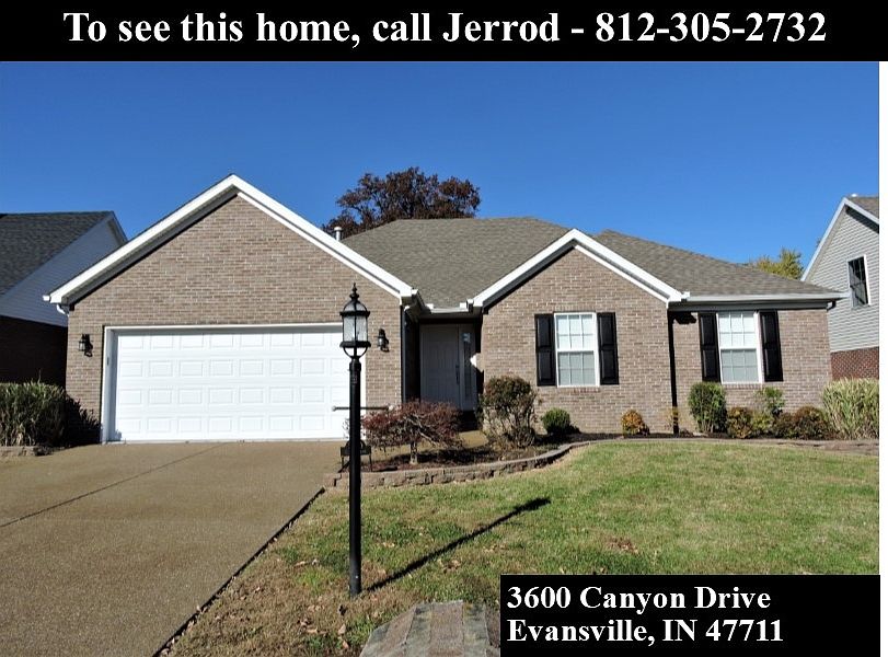 Welcome to 3600 Canyon Drive, located just off Oak Hill Road on Evansville's Northeast side making this home convenient to Schools, and shopping. Thisfull brick ranch style home features 3 bedrooms and 2 full baths with over 1576 sq ft of living space. Facing the home you will notice the exposed aggregate driveway, stately brick facade and the beautifully landscaped yard. Once inside you will notice the spacious great room that features a Cathedral ceiling and a gas fireplace. The great room also has engineered hardwood flooring that continues into the dining room and the kitchen. The kitchen is open to the dining room and features a large breakfast bar and all the appliances. The dining room opens out to a nice concrete patio which provides a great place to entertain friends and family. The backyard also has a nice wood privacy fence making it a safe place for small children and or pets. The master bedroom is spacious and features a walk-in closet and it's own private bath. The entry room, bathrooms, and the laundry all have ceramic tile flooring making easy to keep clean. The attached garage also has a pull-down attic stairway to the extra storage space in your attic.